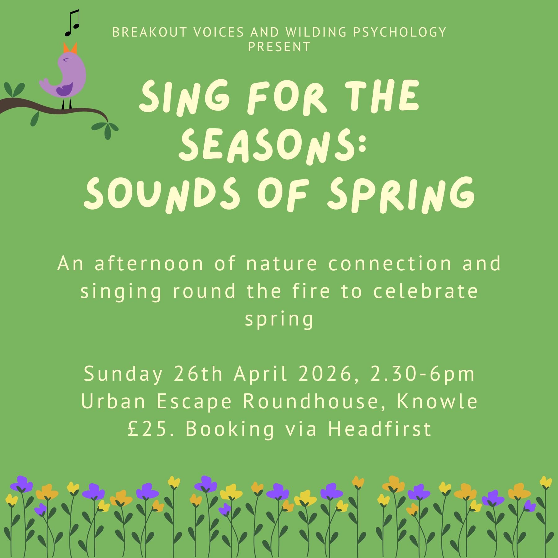 Sunday 26th April, 2.30-6pm - Public access singing and nature connection workshop to celebrate spring. Tickets and more info here: https://hdfst.uk/e150741